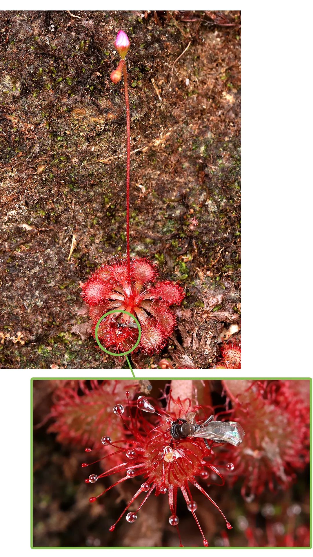 ▲植物的逆袭。食虫植物勺叶茅膏菜用粘液捕捉昆虫,补充蛋白。南兆旭/摄