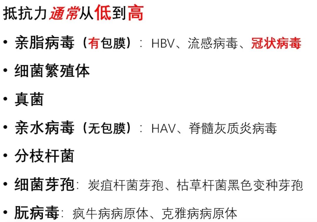 不同的病原微生物,对消毒因子的抵抗力有高有低。我们按照抵抗力从低到高,最弱的就是“亲脂病毒”,其次是细菌,最强的是细菌芽孢和朊病毒。