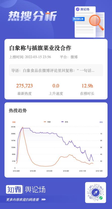 阶段二(3月15日-25日):在315晚会、主流媒体集中关注下,白象集团“315晚会”后的霸气回应拉动全网曝光量飙升,#白象称与插旗菜业没合作#等多个微博话题热度持续上扬。次日各个渠道曝光量达到阶段性高峰,其中短视频环比高达880.67%。第三方直播数据统计平台灰豚数据显示,白象官方抖音号一周新增粉丝近30万,直播销售额达770多万元。