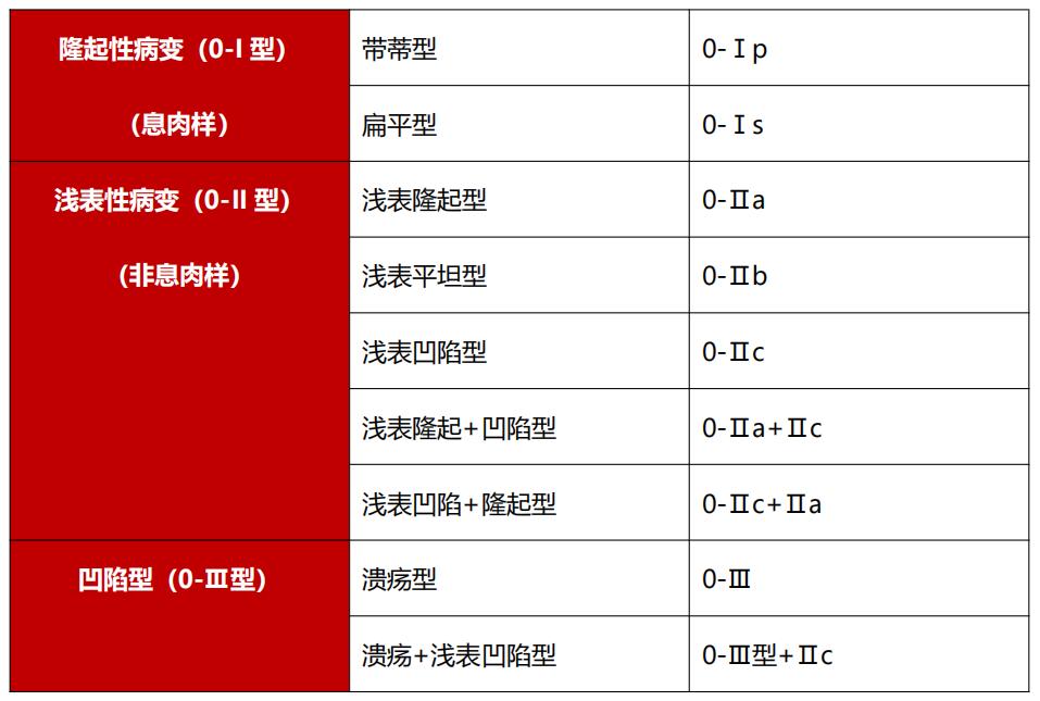 巴黎分型是以描述病灶形态为主的分型方式,在早期食管癌、胃癌中分为3型:隆起型病变(0-I型),浅表性病变(0-II型)及凹陷型(0-III型),以上三种分型根据不同病灶具体形态又衍生出不同分型(表1)。