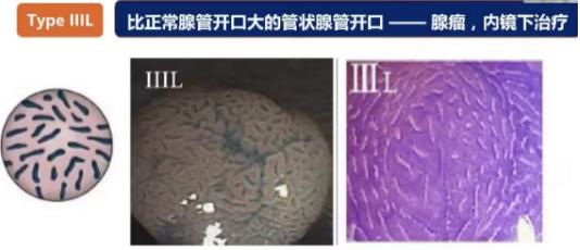 在大肠腺瘤性病变中使用放大内镜结合色素喷洒可以观察到病变腺管开口,依据腺管开口形态,可以较为准确的推断病变性质及浸润深度,从而决定病变的治疗方式,临床常用的腺管开口分型是日本工藤近英教授提出的Pit pattern分型(表3)。