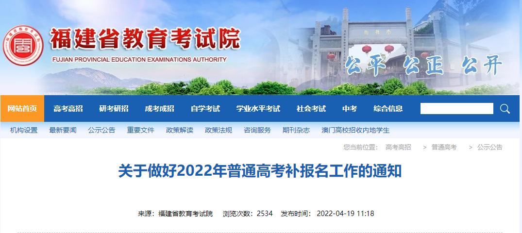 根据《教育部关于做好2022年普通高校招生工作的通知》(教学〔2022〕1号)、《福建省高等学校招生委员会 福建省教育厅关于做好2022年普通高等学校招生考试报名工作的通知》(闽招委〔2021〕8号)等有关规定,为做好2022年普通高考补报名工作,现将有关事项通知如下: