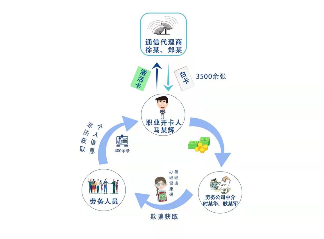 2019年12月,被告人徐某、郑某合谋在杭州市、湖州市、诸暨市等地非法从事手机卡“养卡”活动。即先由郑某利用担任手机卡代理商的便利,申领未实名验证的手机卡(又称“白卡”);再以每张卡人民币35元至40元的价格交由职业开卡人马某辉;马某辉通过在江苏省的劳务公司员工时某华、耿某军等人,以办理“健康码”、核实健康信息等为由,非法采集劳务公司务工人员身份证信息及人脸识别信息,对“白卡”进行注册和实名认证。为规避通信公司对外省开卡的限制,时某华、耿某军利用郑某工号和密码登录内部业务软件,将手机卡开卡位置修改为浙江省。此外,马某辉还单独从赵某处购买公民个人信息400余条用于激活“白卡”。