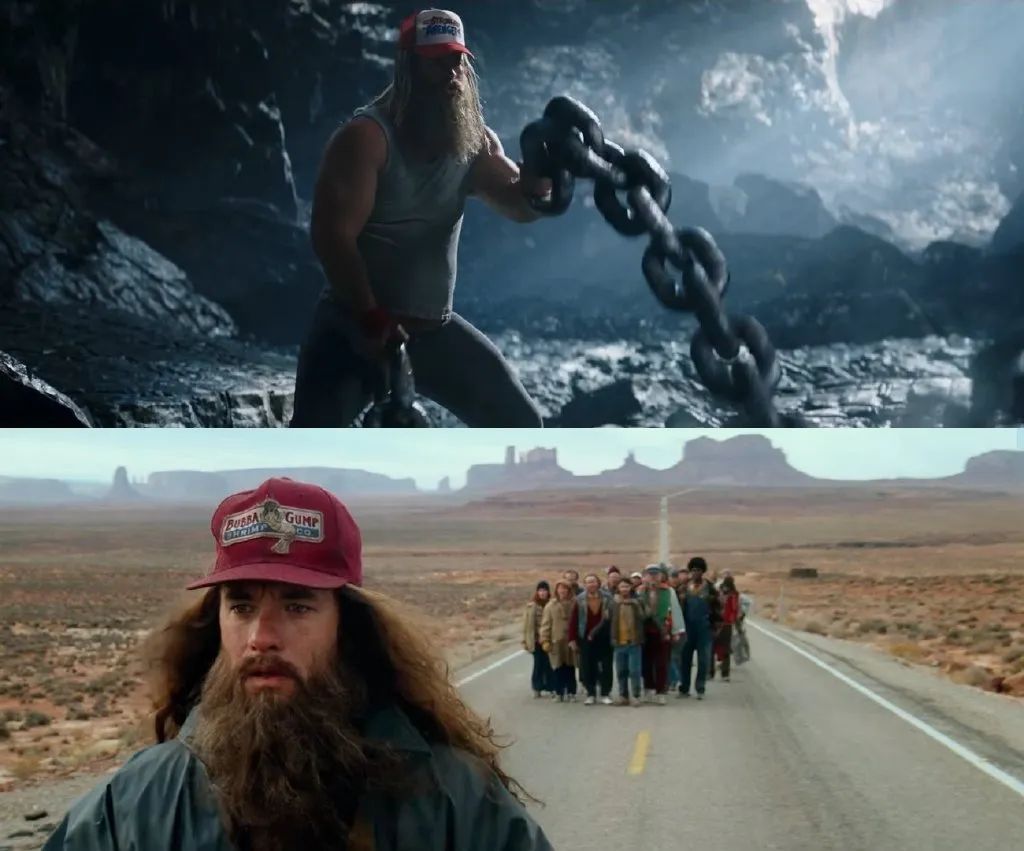 《雷神4》(上),《阿甘正传》(下)鸭舌帽的字样,写的是“STRONGEST AVENGER”(最强大的复仇者)。