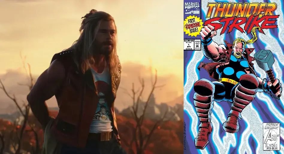 无袖红皮衣造型,主要致敬90年代漫画,托尔人间替身“雷霆战士”(Thunder Strike)形象。胸口的图案,则对应着北欧神话中的九大宇宙国度“九界”。