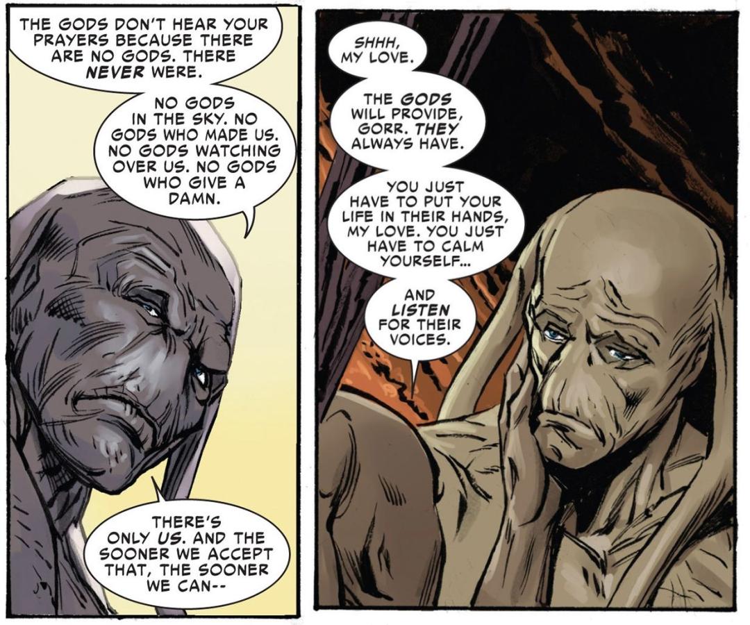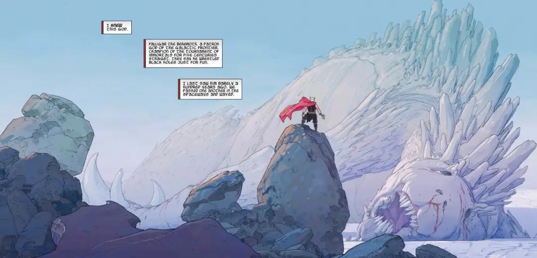 这个镜头,像素级临摹致敬了漫画《雷神 V5》(Thor:God of Thunder)第三期。这只巨兽叫作法利加(Falligar),银河边界的守护神明,托尔的至交好友。
