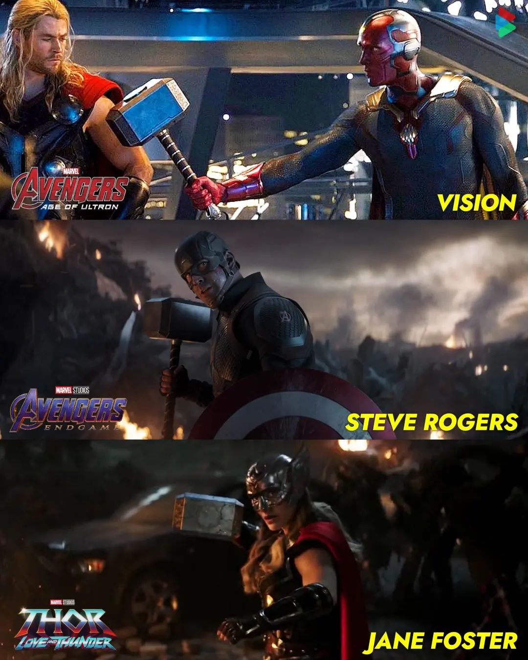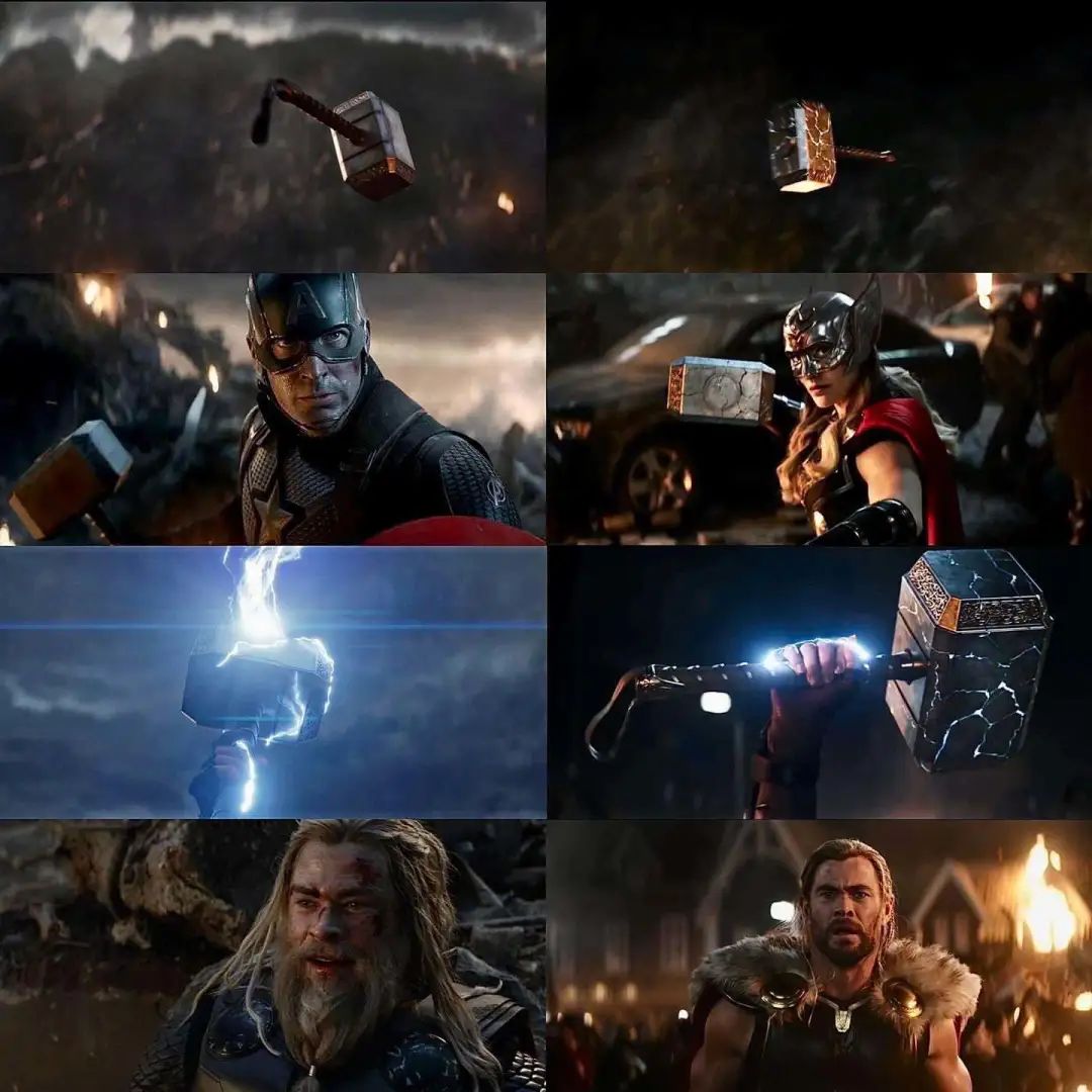 《复联4》(左)实际上,她也是除托尔之外,第三位举起雷神之锤的角色。
