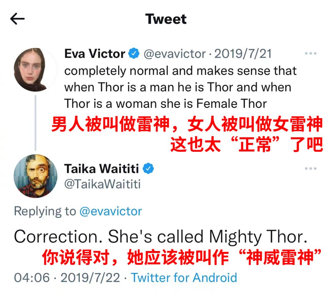 很多人喜欢将她称为“女雷神”,其实这并不准确。塔导有过回应,不应刻意强调她的性别,就像从来没人强调托尔为“男雷神”。