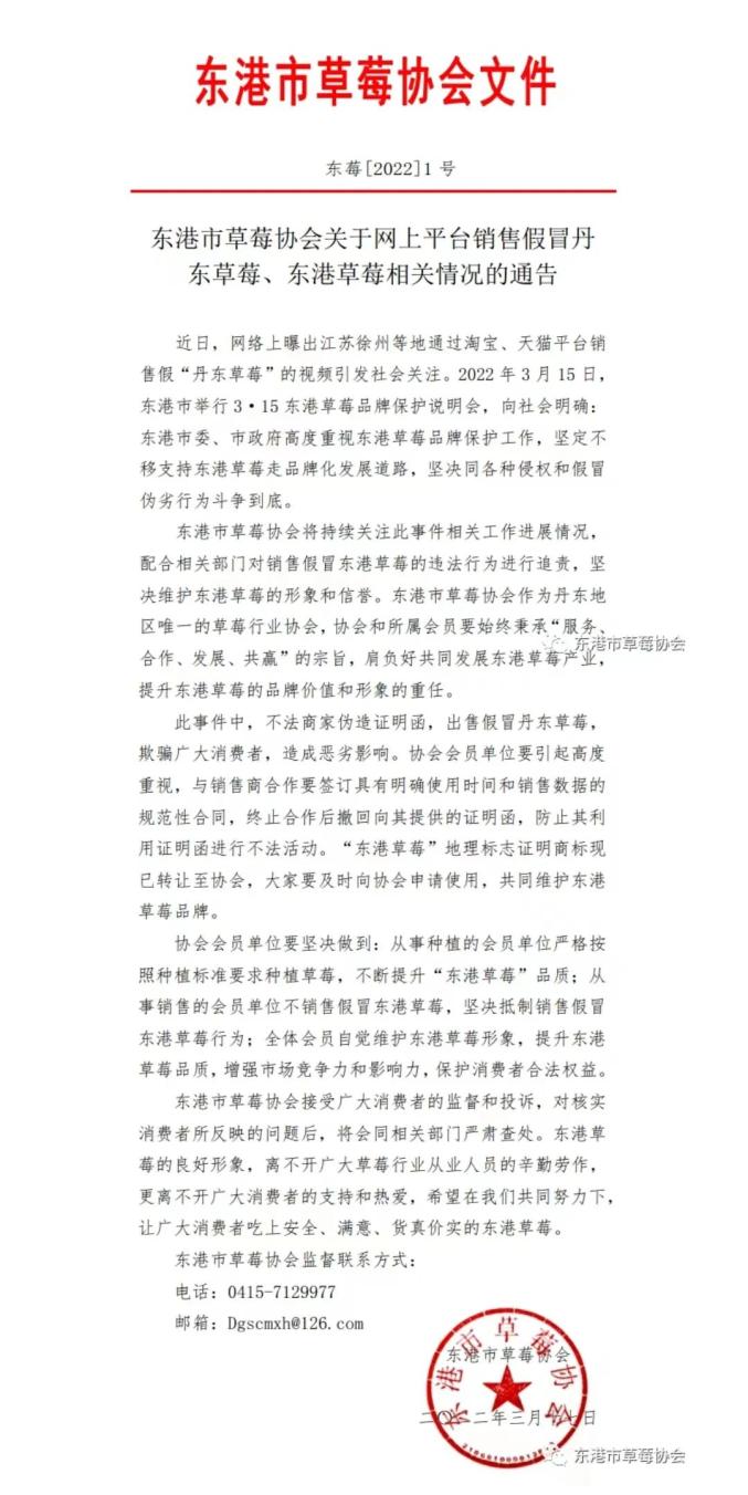 事情发生后,丹东草莓主产区——辽宁省丹东市下属东港市召开品牌保护说明会,对冒充丹东草莓、东港草莓销售的违法行为将采取法律措施进行维权。东港市市场监管局将取证证据打包,寄送给涉事电商所在地的市场监管部门。随后,东港市草莓协会对外发布通告,称协会将对视频中曝光的假冒东港草莓违法行为进行追责,同时呼吁协会会员与销售商合作要签订具有明确使用时间和销售数据的规范性合同,终止合同后撤回向其提供的证明函,防止商家利用证明函进行不法活动。目前,“东港草莓”地理标志已转至东港市草莓协会。