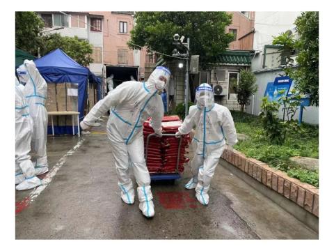 每天起床,体温监测、抗原自检成了众人工作前的必备环节。4月的上海,白天室外最高气温已经达到28度上下,身着防护服的几人在作业中几次被“蒸”到濒临晕厥。由于街道人手稀缺,他们每天8点就来到物资分拣中心,尽量用上午的时间完成卸车和分拣工作,“一般忙到13点才会回驻地吃午饭。”下午的时间用来给居民配送物资,黄向荣回忆,11、12号两天,几批救援物资集中抵达,“送完最后一批物资已是深夜。”