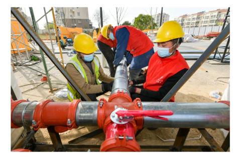 3月24日,郭明义爱心团队中建二局江苏分队50余名志愿者援建1000余套隔离房。时间紧、任务重,志愿者们携手同心,用“加速度”完成隔离房内水电等配套设施建设,并在8小时内完成整个污水处理系统的安装及调试,包含2个水塔、4台污水泵及配套阀门组,约70米管道的安装和30米电缆的铺设,全力保障南京抗疫稳定有序。(李天心)为返校复课保驾护航