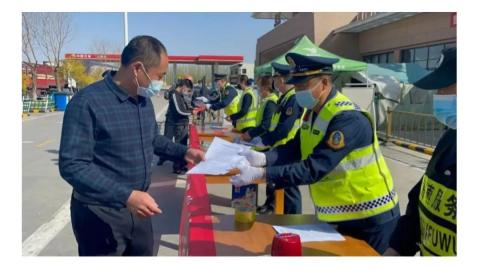 4月5日20时左右,甘肃高速公路路政执法总队派驻武威服务区“司机之家”负责人赵海鹏在“陇原红运”(2)微信群中注意到,一名货车司机在群内留言,称自己从浙江杭州前往甘肃酒泉送货,原打算4月5在武威下高速后做核酸检测,可到武威后方知,外地人员来武威市凉州区须提前三天报备,直达酒泉又怕核酸检测结果过期下不了高速。看到留言后,赵海鹏主动与李师傅电话联系,向他耐心解释完当地疫情防控政策后,立即电话联系酒泉服务区经理说明情况。酒泉服务区经理随即与李师傅联系,让他继续前往酒泉,并承诺帮其解决困难。李师傅到酒泉后,酒泉服务区经理派专人引导他就近做了核酸检测,使他能够如期顺利送达货物。图为“司机之家”团队员工向货车司机发放安全行车宣传单。(汪晓霞 张超)