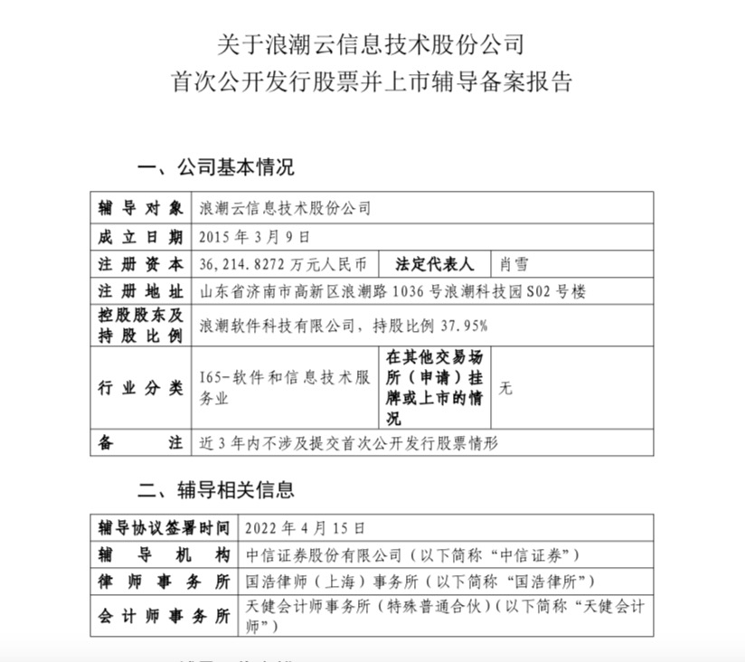 彼时,中信证券受聘担任浪潮云首次公开发行股票并在科创板上市的辅导机构,双方于2020年6月22日签署了辅导协议,并于当天向山东证监局报送辅导备案申请材料并获得受理。2020年11月16日,中信证券完成对浪潮云的上市辅导工作,并向山东证监局报送了辅导总结报告。