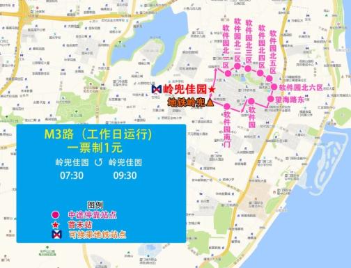 (二)停靠站点(单向停靠):岭兜佳园、软件园北一区、软件园北二区、软件园北三区、软件园北四区、软件园北五区、软件园北六区、望海路东、软件园、软件园南门、岭兜佳园。
