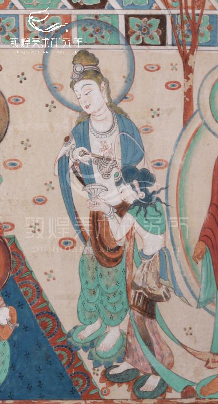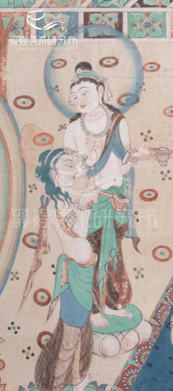 ▲敦煌美术研究所藏品 敦煌美术研究所专家修正临摹作品《舞乐图·初唐》局部上幅画面中的两身菩萨站立在莲花上,各手持一香炉,位于上方的一身头部被半透明的青绿色圆光笼罩着,下方的一身正慈祥的望着中间的舞蹈者。