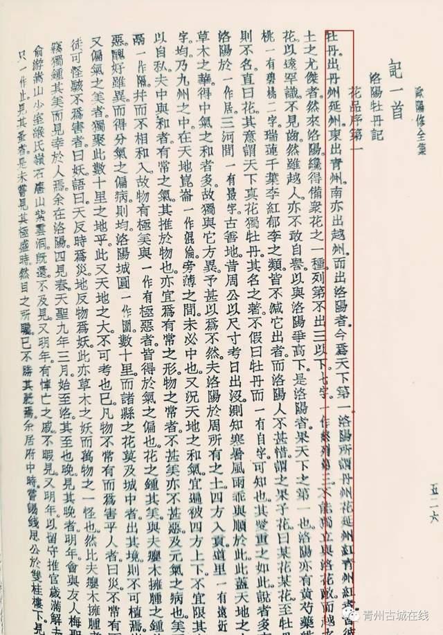 景祐元年(1034),27岁的欧阳修所著的《洛阳牡丹记》(《居士外集》卷二十二),是世界上首部牡丹专著。他在《洛阳牡丹记》中《花品叙第一》写道: