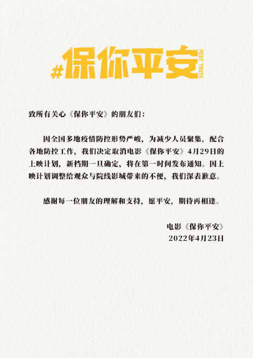 4月23日,由大鹏执导,大鹏、李雪琴、尹正、王迅、王圣迪领衔主演的《保你平安》在官方微博发布公告称,因全国多地疫情防控形势严峻,为了更好地配合防疫工作,决定取消原定于4月29日的上映计划,新档期择日公布。