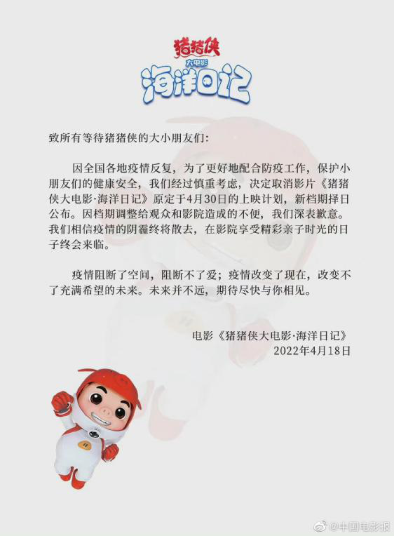 此前,在4月18日,咏声动漫已经宣布,原定于4月30日上映的电影《猪猪侠大电影·海洋日记》撤出“五一”档。