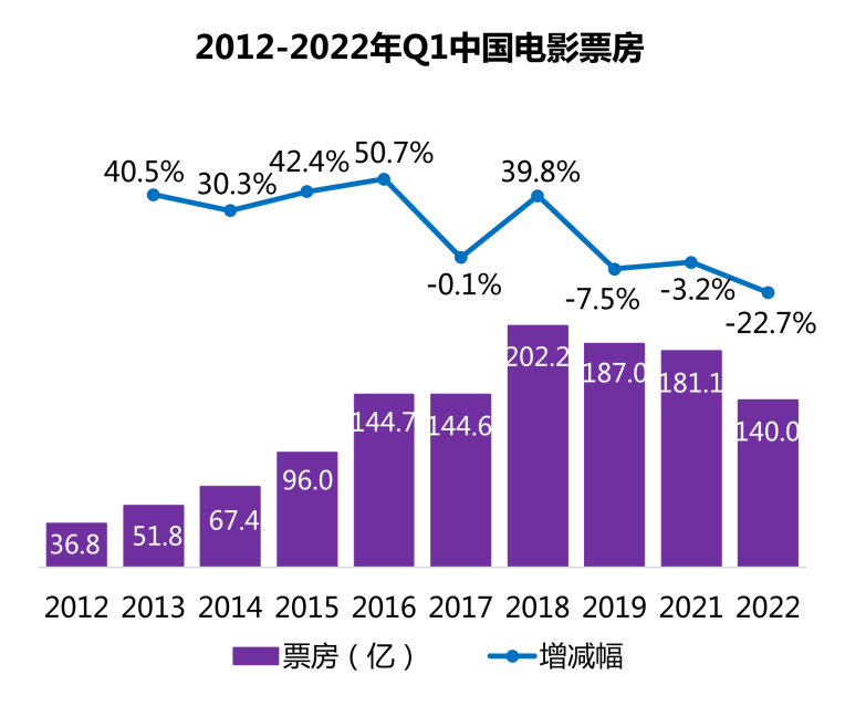 今年以来,全国电影票房惨淡。据艺恩发布的《第一季度中国电影市场报告》显示,2022年第一季度电影票房140.0亿,同比下降22.7%,回落至2016年前水平;3月票房跌幅最为明显,大盘9.1亿元,同比2021年下滑63.5%,为2013年以来票房最低。