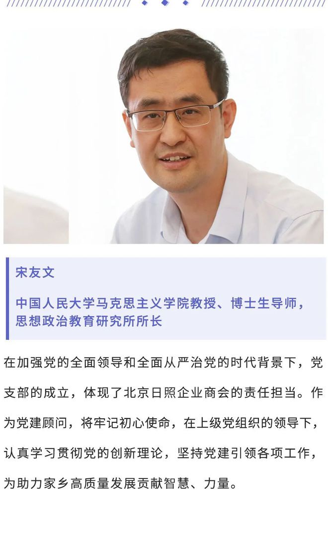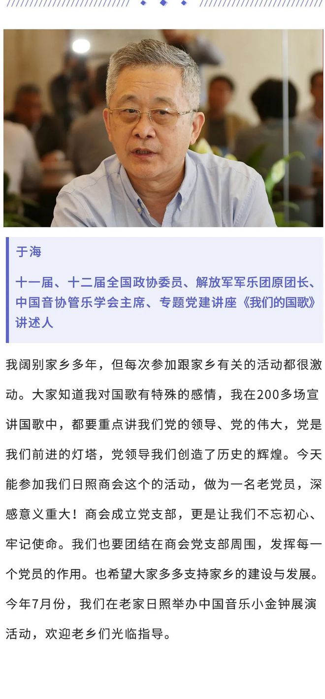 十一届、十二届全国政协委员、解放军军乐团原团长、中国音协管乐学会主席、专题党建讲座《我们的国歌》讲述人于海,全国工商联宣传教育部一级巡视员李忠春,山东省人民政府驻北京办事处党委副书记、一级巡视员杨平,日照市人民政府原副市长、互联网全球根节点运营机构联席主席高振刚,北京市思想政治工作研究会副秘书长王维广,北京山东企业商会书记、中共北京市异地商会第五联合委员会党委委员孙浩天,日照市人民政府驻北京联络处主任钱建德,中国人民大学马克思主义学院教授、博士生导师,思想政治教育研究所所长宋友文,北方工业大学马克思主义学院党委书记、教授张茂林,北京大学马克思主义学院副教授、硕士生导师王聪聪出席活动。商会副会长兼秘书长胡亮、商会副会长、百世诺(北京)医学检验实验有限公司董事长刘哲,商会副会长、京科互联发展集团董事长郑小禄及部分党员代表20余人参加活动。会议由日照市人民政府驻北京联络处主任钱建德主持。