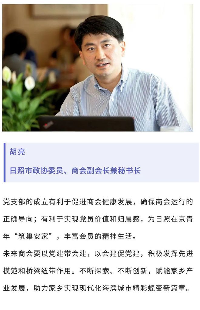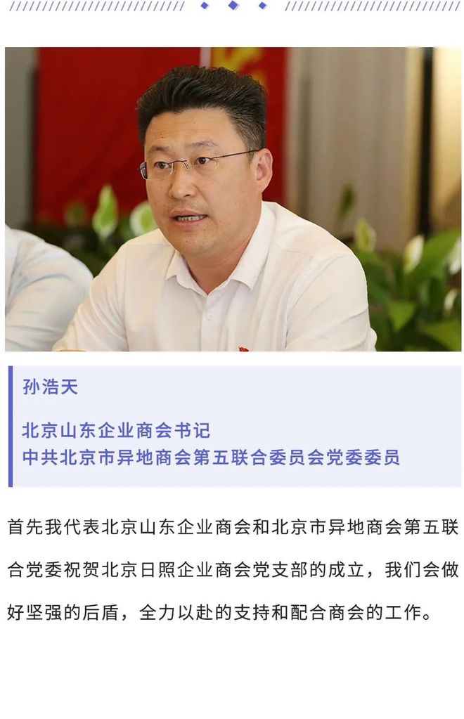 会上,孙浩天宣读了中共北京市异地商会第五联合委员会《关于同意成立中共北京日照企业商会流动党员支部委员会的批复》, 同意成立中共北京日照企业商会流动党员支部委员会,任命胡亮同志为党支部书记。