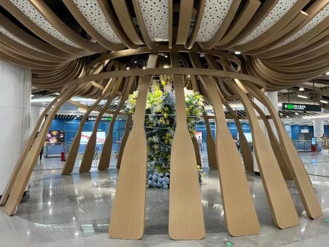 作为连接广州和顺德两地文化交流的纽带,七号线西延段在车站设计上也专门融入了地域文化。在进站时可留意到,出入口飞顶与既有广佛线的设计不太一样,虽然都是采用红色玻璃盒子和剪纸的风格,但是整体外形设计是龙舟的原型简化提炼,中间红色镂空铝板,既是龙舟的主要船体,也象征一条飘舞的香云纱色带。
