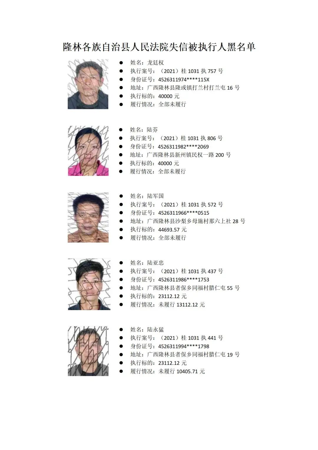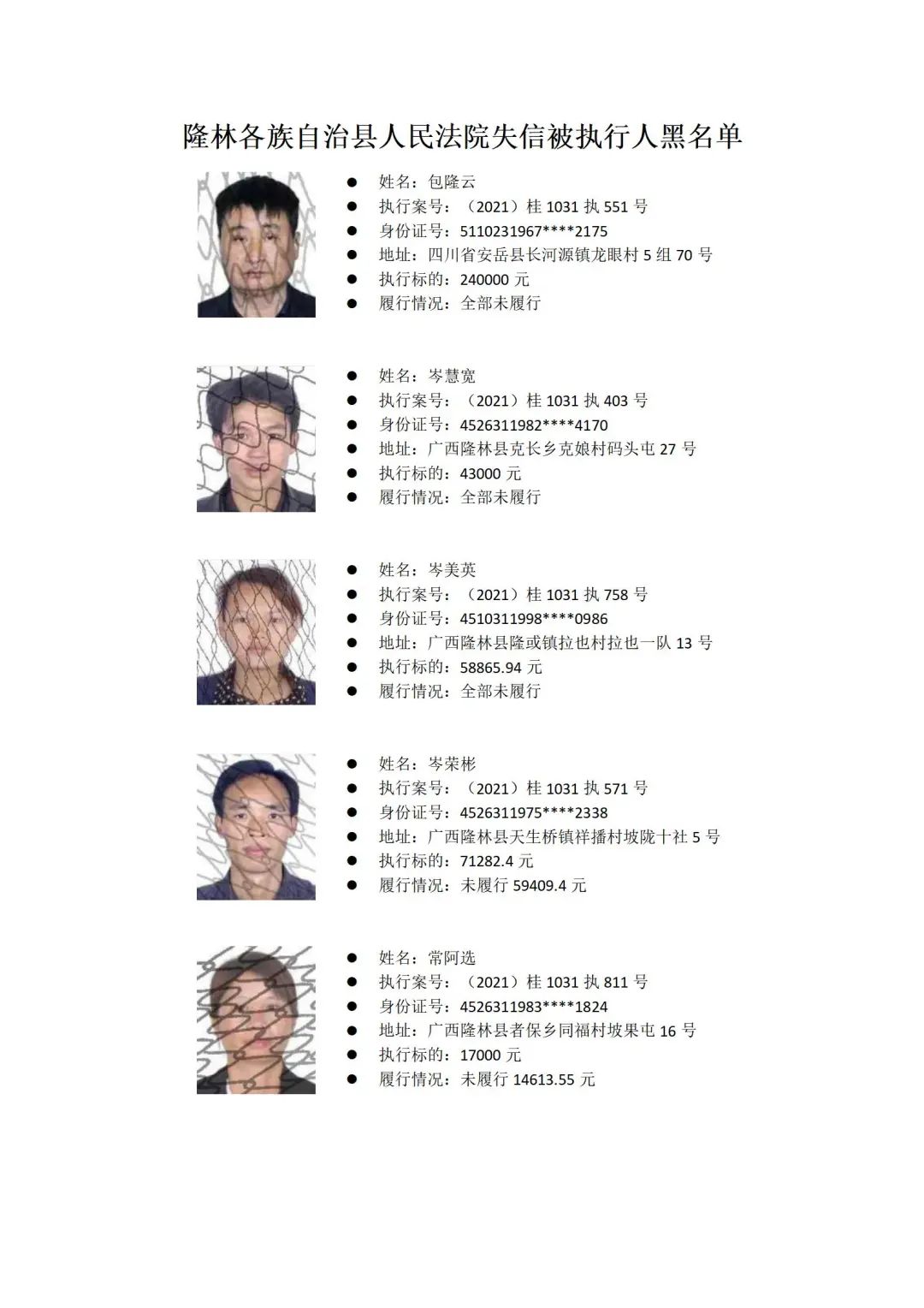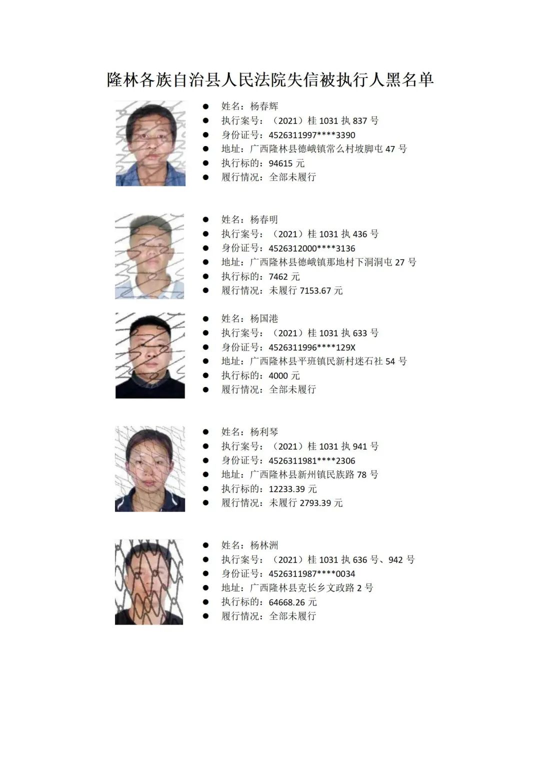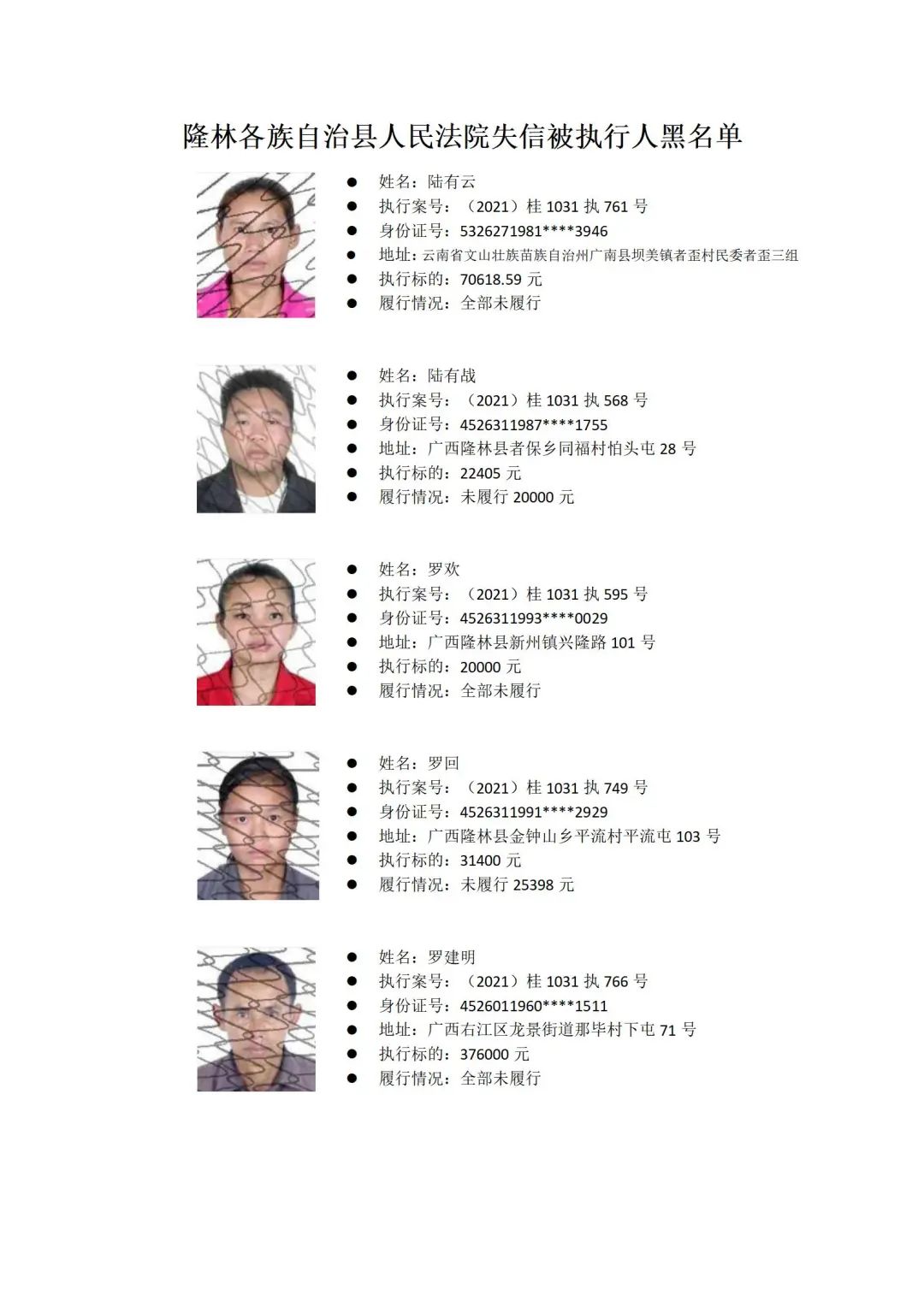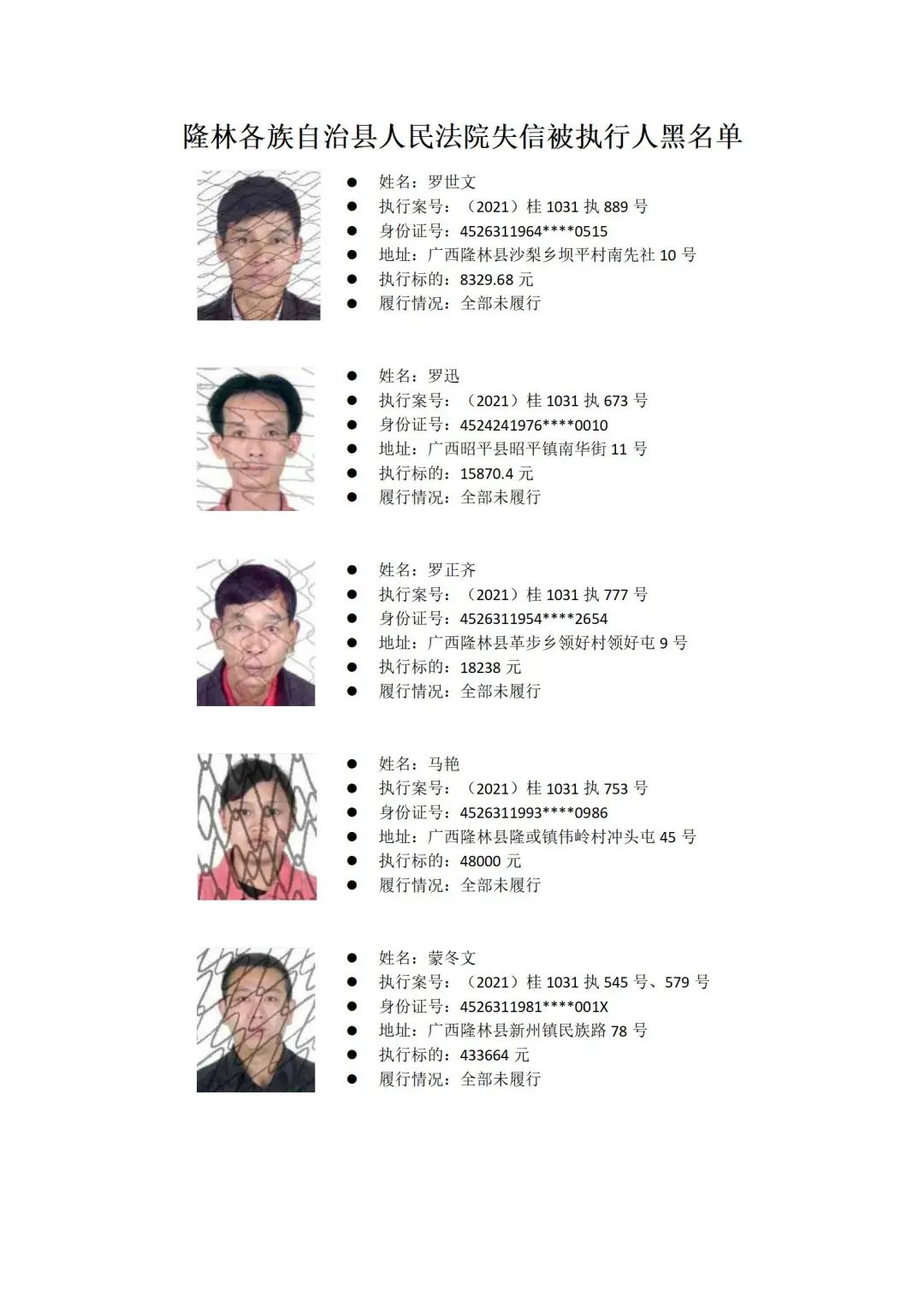 为切实维护申请执行人的合法权益,促使被执行人自觉履行生效法律文书确定的义务,推进社会信用体系建设,维护司法权威,根据《中华人民共和国民事诉讼法》第二百五十五条、《最高人民法院关于公布失信被执行人名单信息的若干规定》第七条的规定,经依法审查,现隆林各族自治县人民法院决定对下列被执行人信息,予以公开曝光。