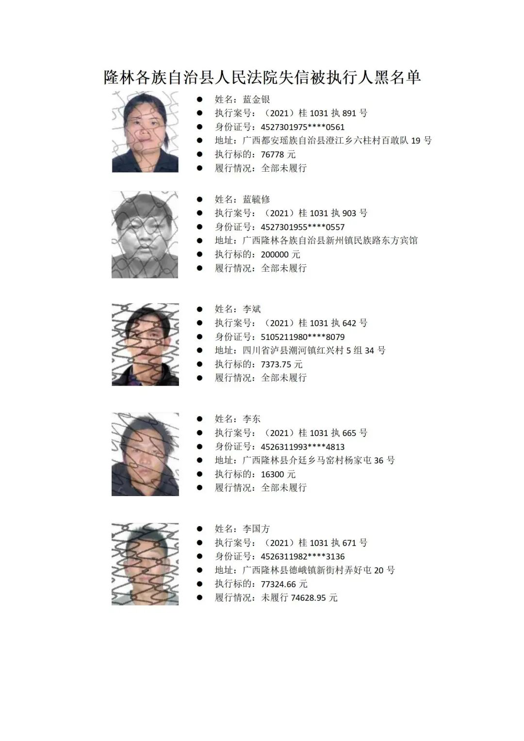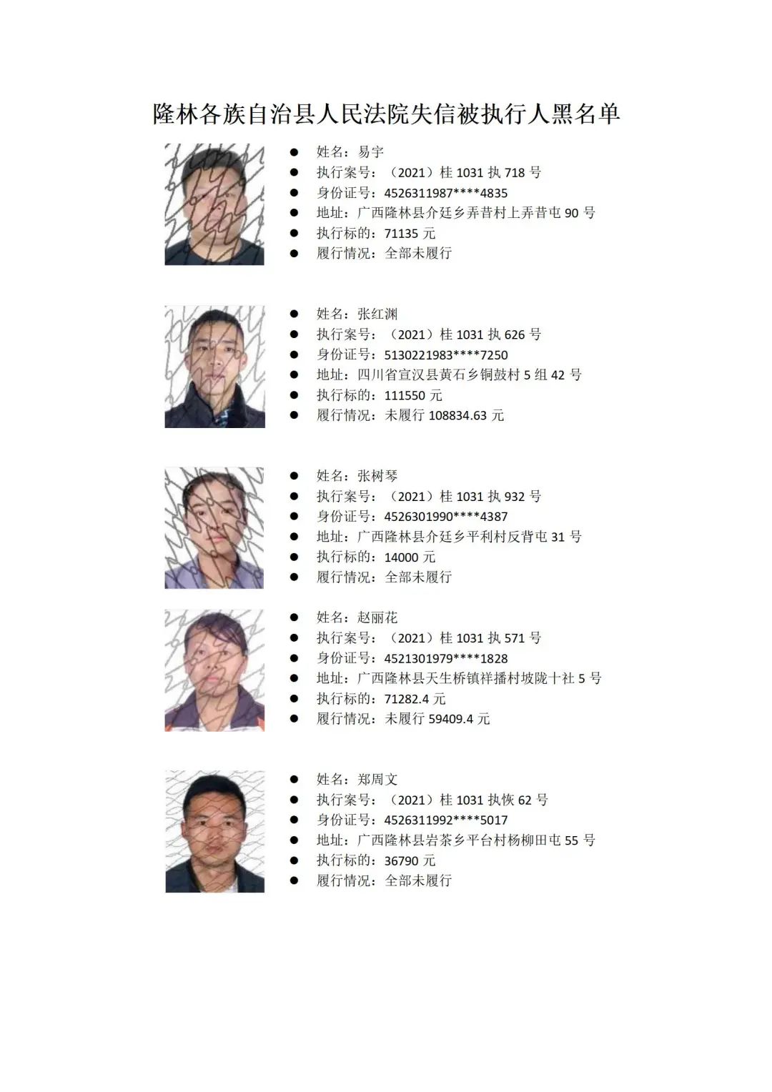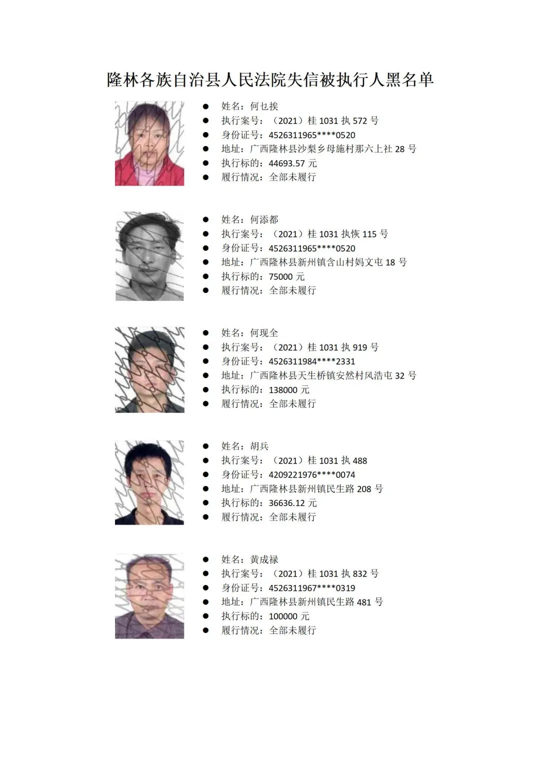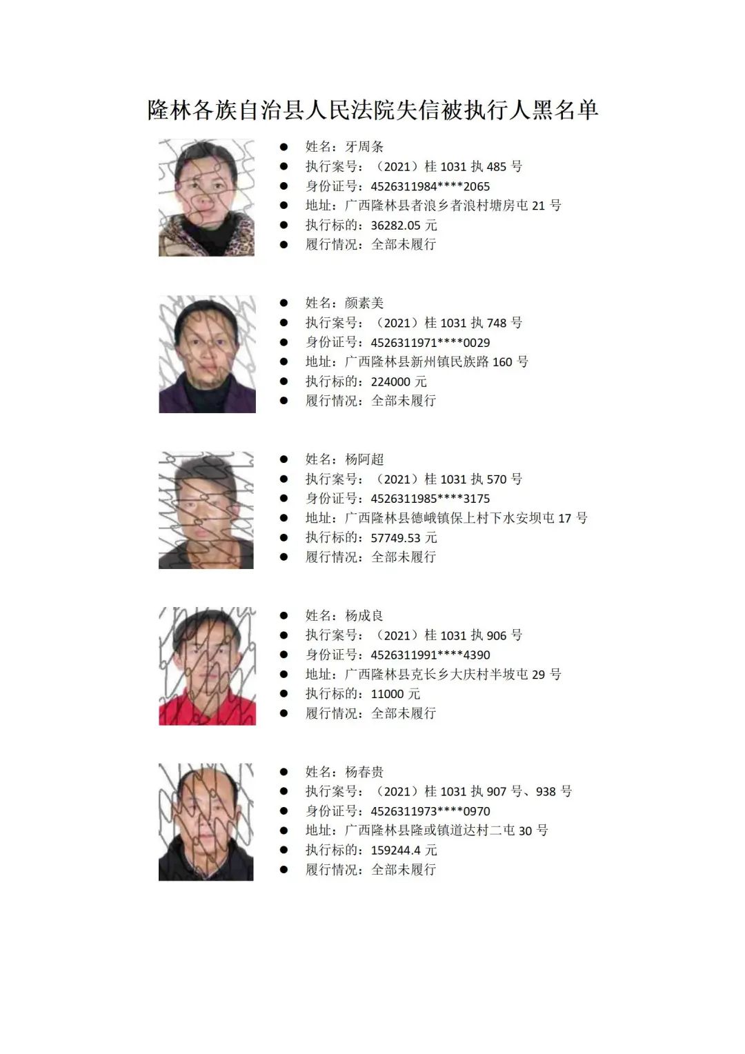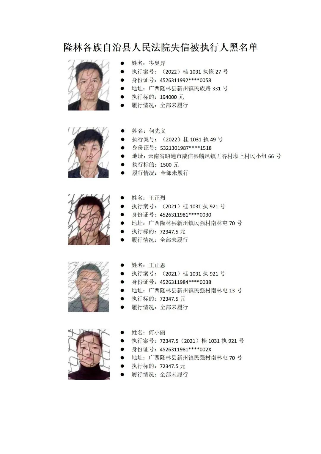 为切实维护申请执行人的合法权益,促使被执行人自觉履行生效法律文书确定的义务,推进社会信用体系建设,维护司法权威,根据《中华人民共和国民事诉讼法》第二百五十五条、《最高人民法院关于公布失信被执行人名单信息的若干规定》第七条的规定,经依法审查,现隆林各族自治县人民法院决定对下列被执行人信息,予以公开曝光。