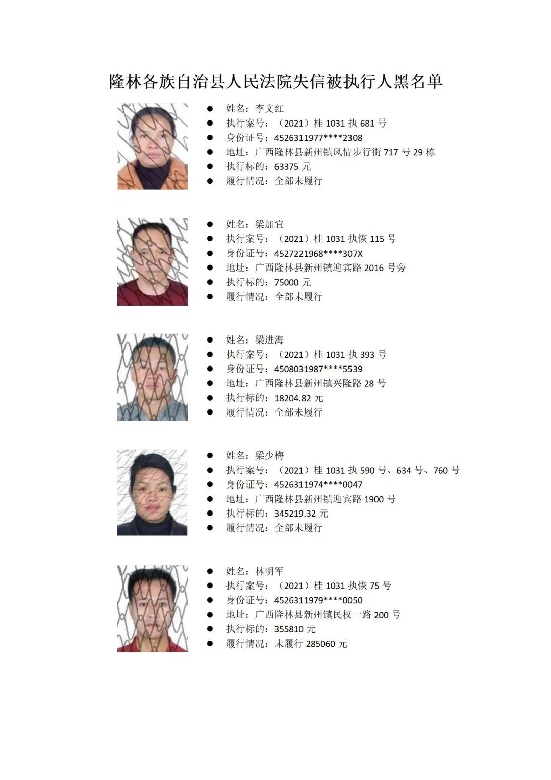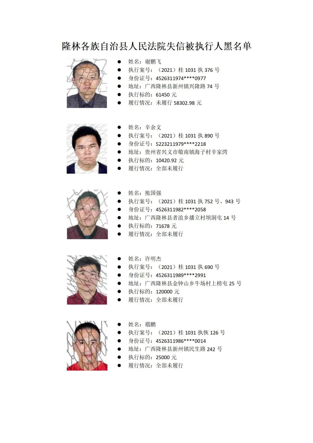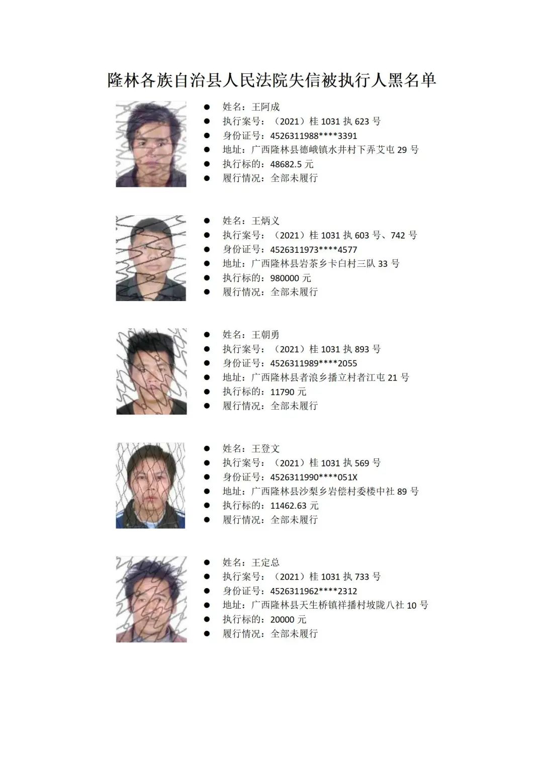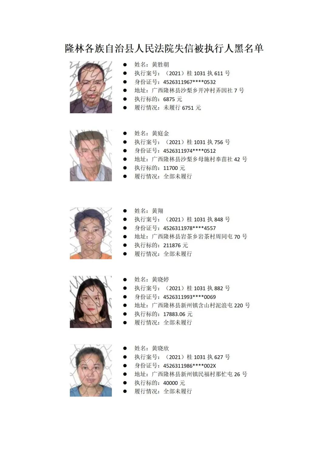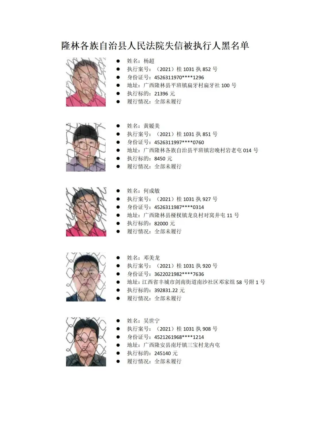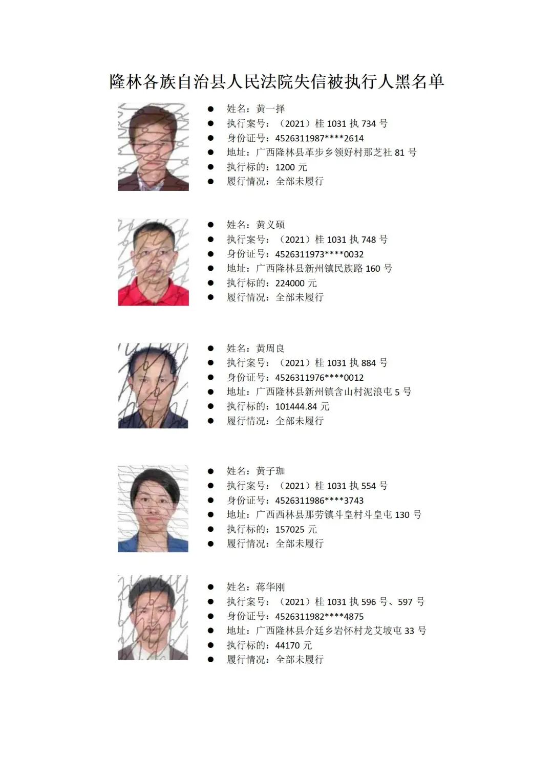 为切实维护申请执行人的合法权益,促使被执行人自觉履行生效法律文书确定的义务,推进社会信用体系建设,维护司法权威,根据《中华人民共和国民事诉讼法》第二百五十五条、《最高人民法院关于公布失信被执行人名单信息的若干规定》第七条的规定,经依法审查,现隆林各族自治县人民法院决定对下列被执行人信息,予以公开曝光。