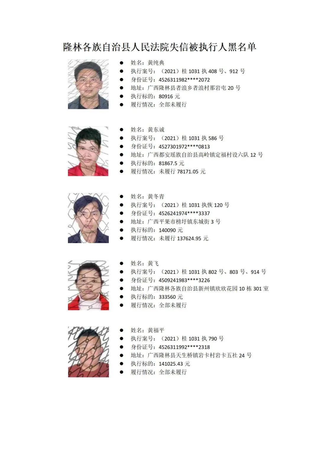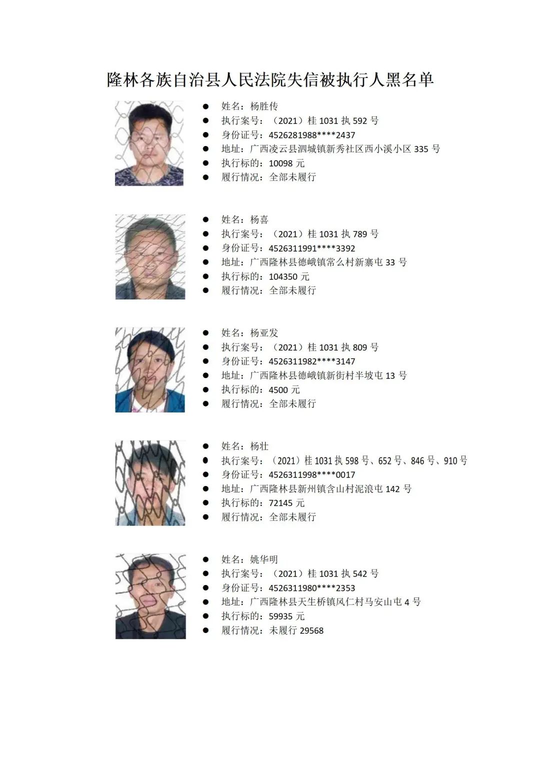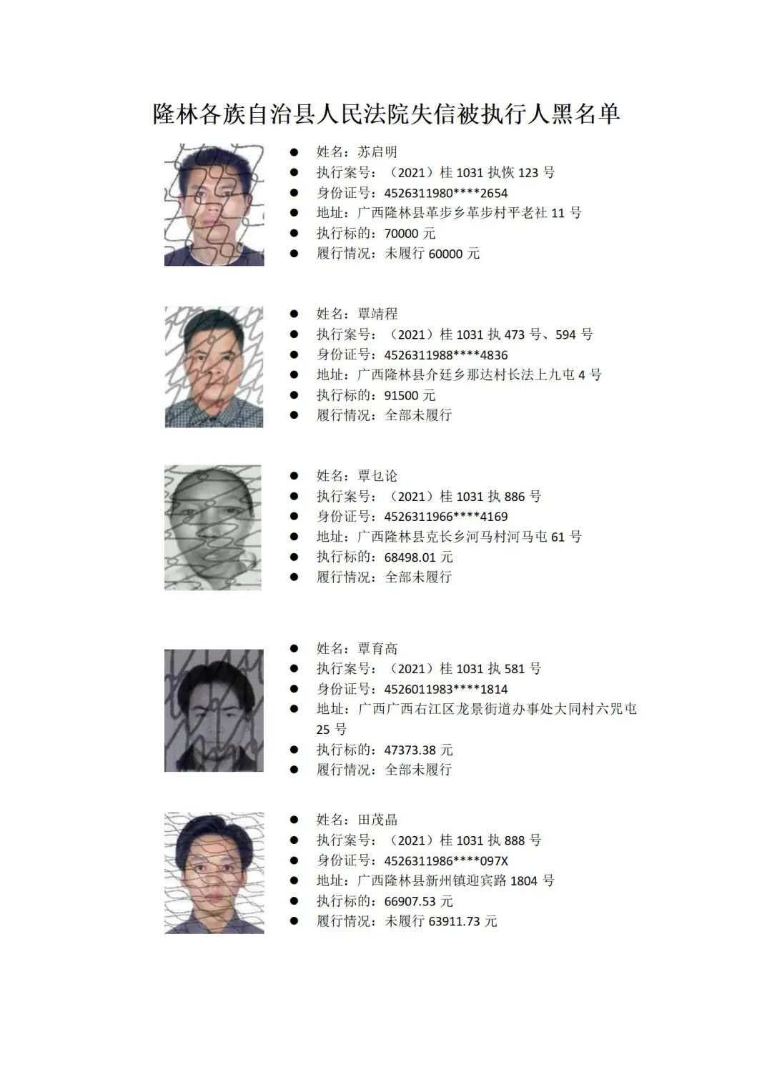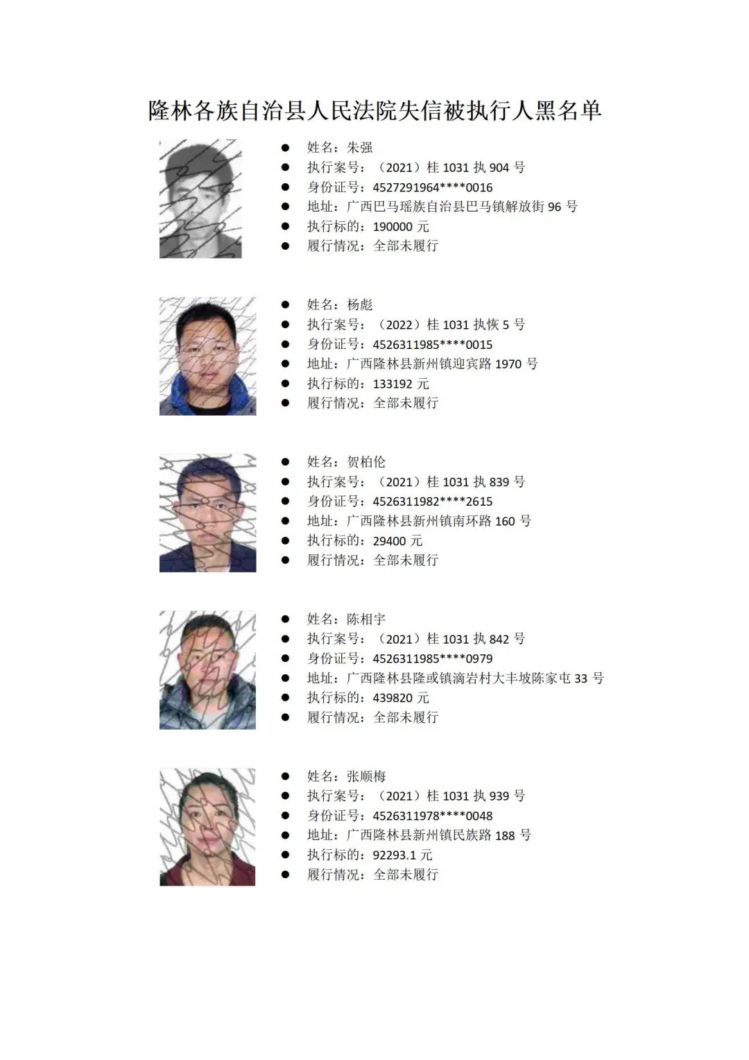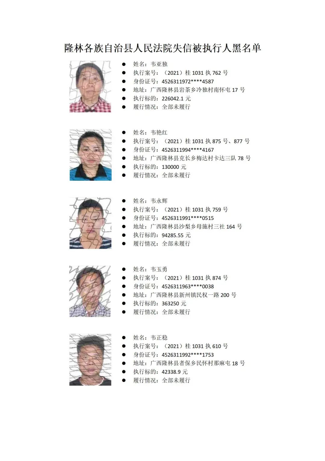 为切实维护申请执行人的合法权益,促使被执行人自觉履行生效法律文书确定的义务,推进社会信用体系建设,维护司法权威,根据《中华人民共和国民事诉讼法》第二百五十五条、《最高人民法院关于公布失信被执行人名单信息的若干规定》第七条的规定,经依法审查,现隆林各族自治县人民法院决定对下列被执行人信息,予以公开曝光。