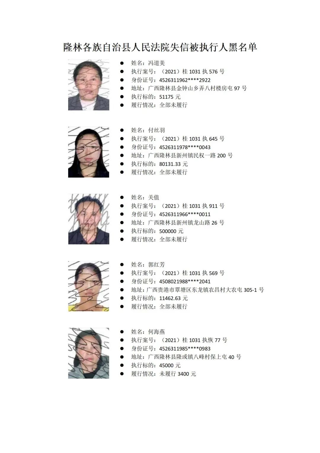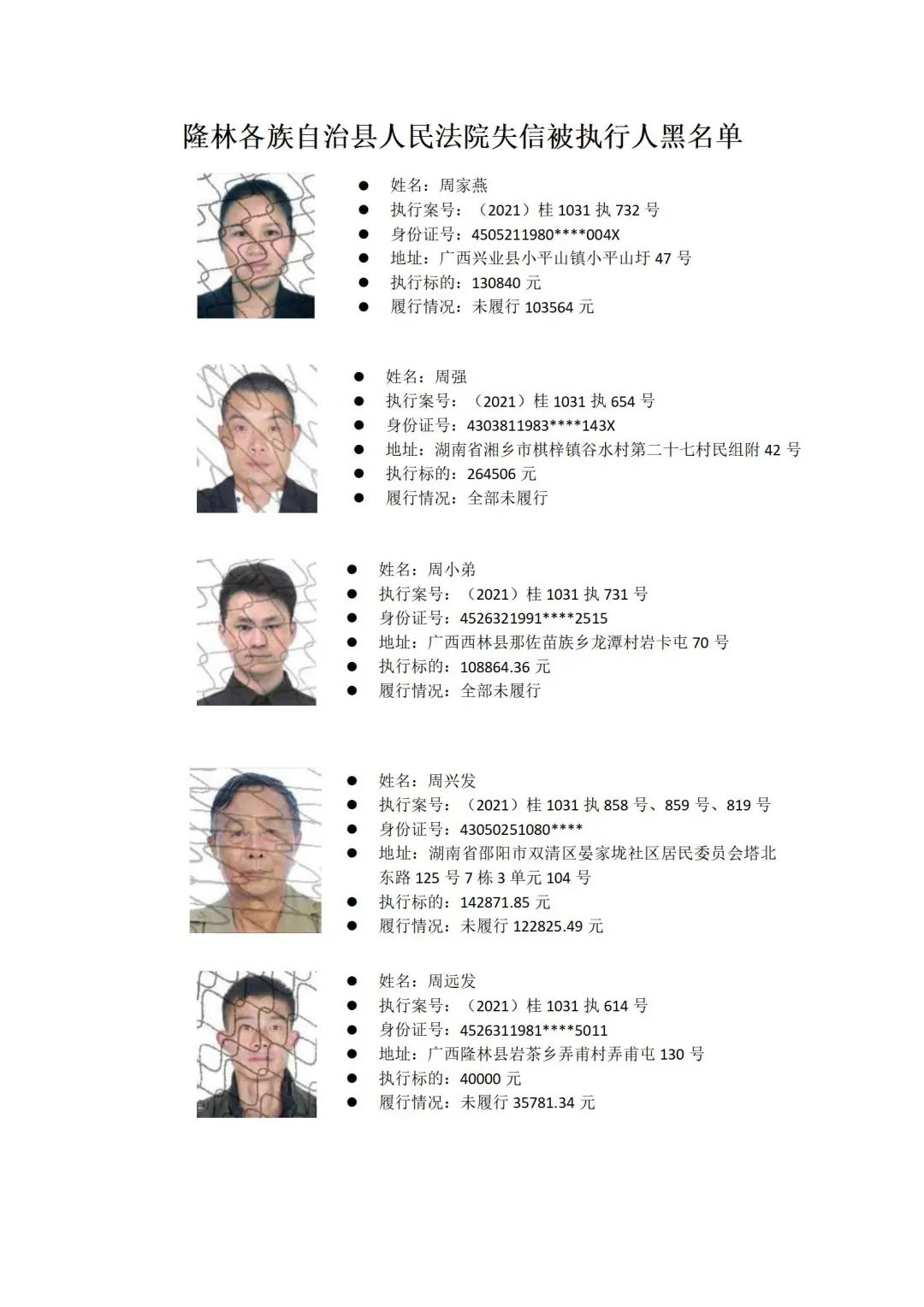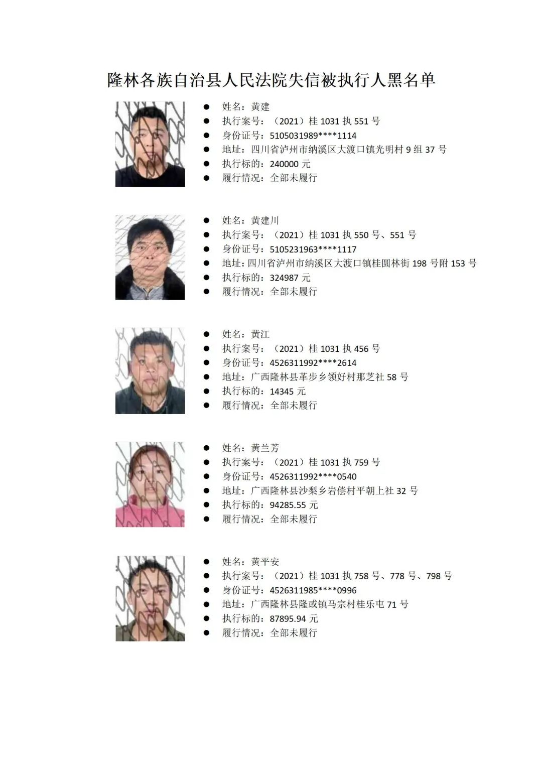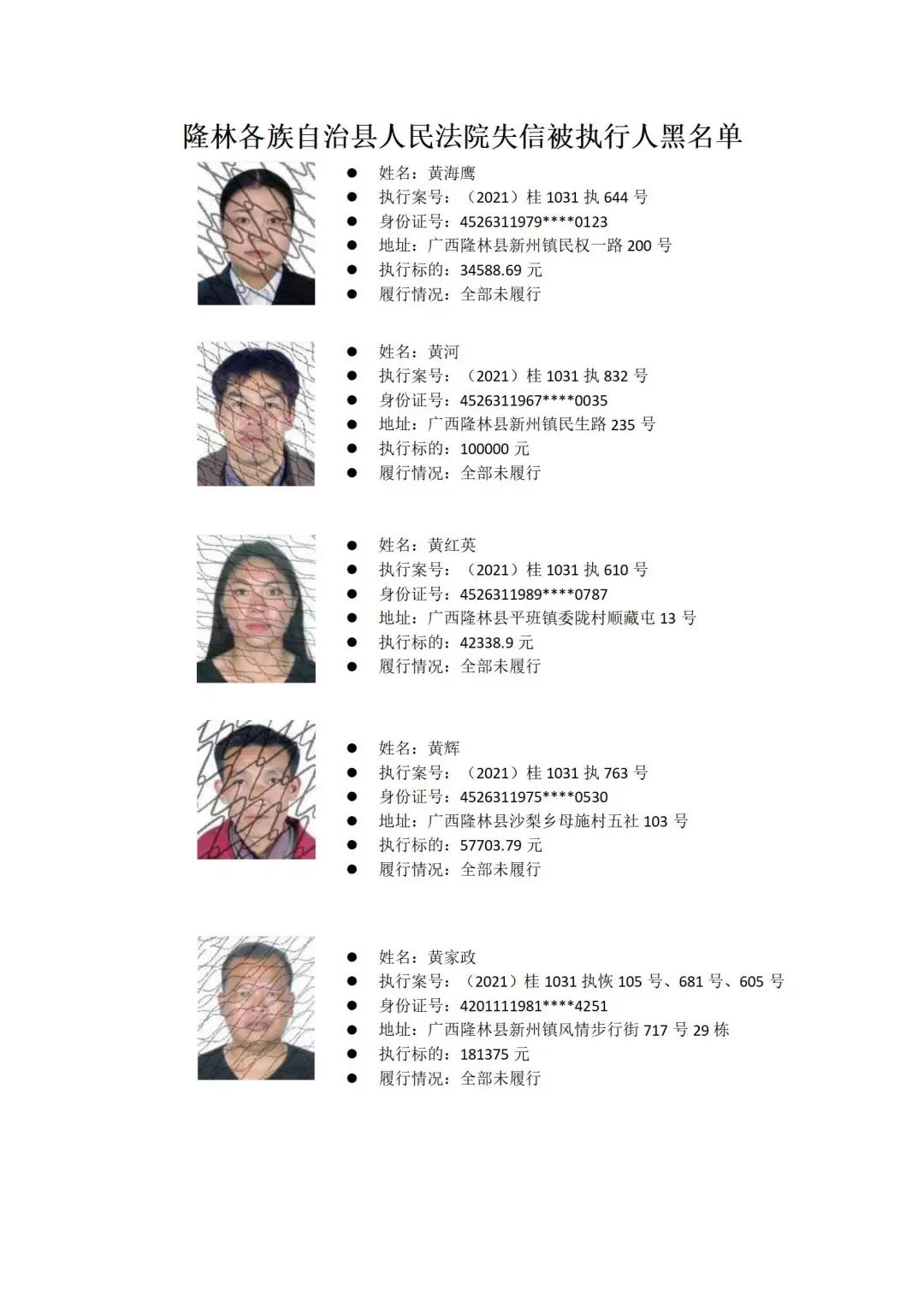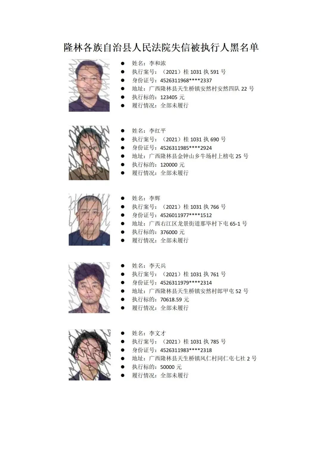 为切实维护申请执行人的合法权益,促使被执行人自觉履行生效法律文书确定的义务,推进社会信用体系建设,维护司法权威,根据《中华人民共和国民事诉讼法》第二百五十五条、《最高人民法院关于公布失信被执行人名单信息的若干规定》第七条的规定,经依法审查,现隆林各族自治县人民法院决定对下列被执行人信息,予以公开曝光。