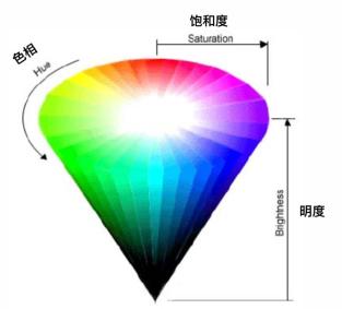 其实这些形容反映的是我们理解颜色的三个维度:色相(hue)、饱和度(saturation)、和明度(value)。色相对应主要的光的波长,如蓝与绿的区别;饱和度对应光的复杂程度,如蓝与灰蓝的区别;明度对应光波的振幅,如浅绿与深绿的区别。