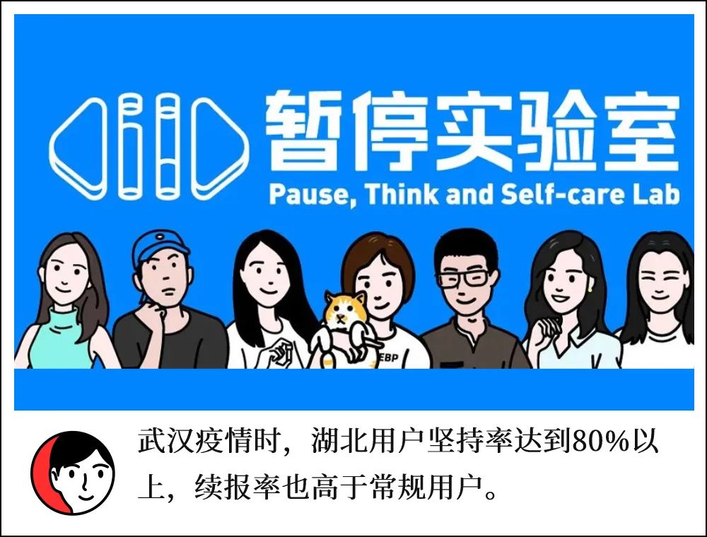 A:当时我们招募的样本没有那么多,我们针对整个湖北地区做了一个公益的产品,当时产品常规定价是每个周期448元,完成后返100元,但在湖北地区公益价格为100元,完成后返100元,相当于免费。我们发现虽然使用的是免费产品,但湖北用户的坚持完成率达到了80%以上;而往常用户坚持率低一些,为60%到70%。我们还追踪了这部分湖北用户的后续行动,发现他们的续报率(进入下一期行动营和长期持续行动)比常规用户还要高,这个工具确实在疫情时期给他们带来了帮助,而且这个帮助也不是暂时的。我们也鼓励有持续压力的用户把这个地方当成心理健身房,长期去练习。