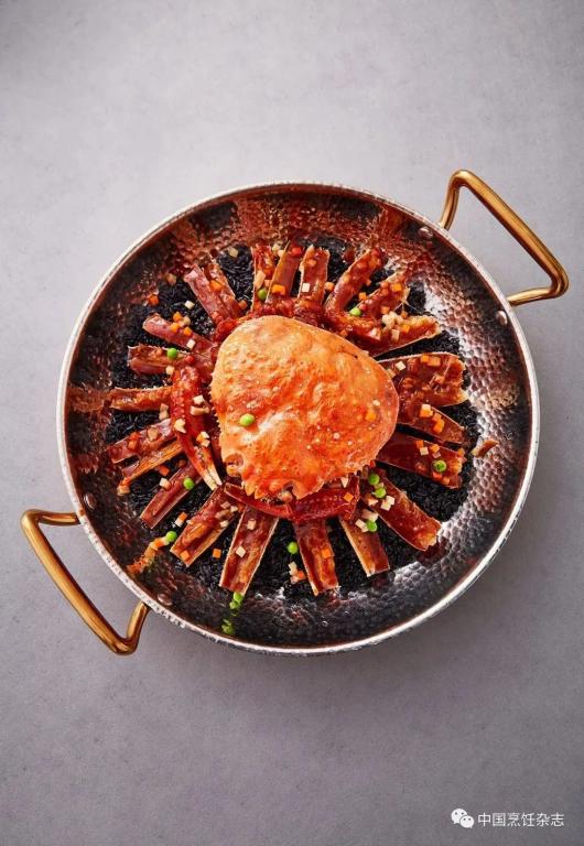 这道菜选用的器皿是不锈钢锤目纹双耳平锅。锅外径加双耳达45厘米,内径为38厘米,适合900克大小的松叶蟹,整体造型饱满,能保证适度留白。据制作者介绍,这只不锈钢平锅色泽金黄,加工成熟后的松叶蟹色泽明红,在金黄色器皿的衬托下非常大气、高端。