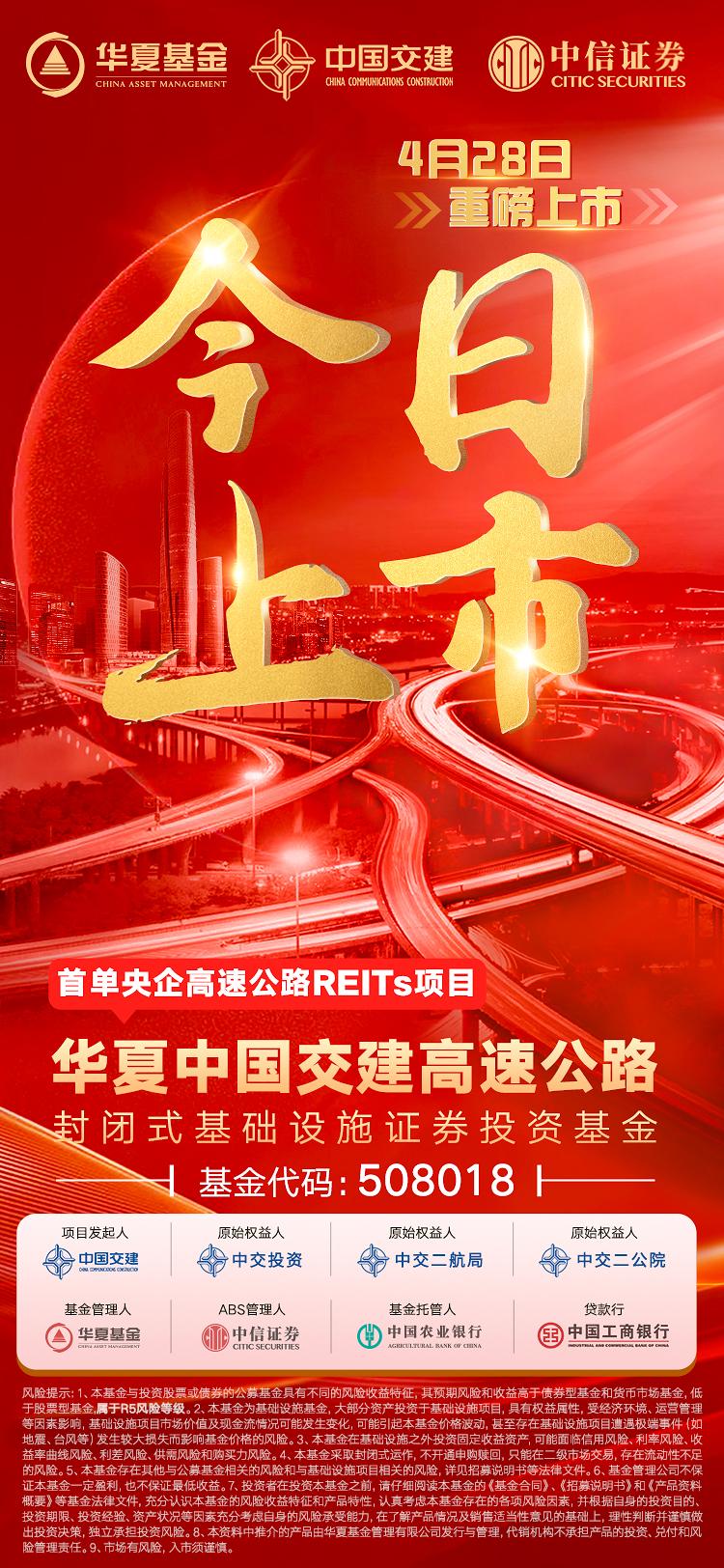 2022年4月28日,在国家发改委、中国证监会和上海证券交易所的指导下,以及湖北省有关部门的大力支持下,备受关注的2022年首单公募REITs、首单央企高速公路REITs——华夏中国交建REIT(场内简称:中交REIT,场内交易代码:508018)正式在上海证券交易所鸣锣上市。