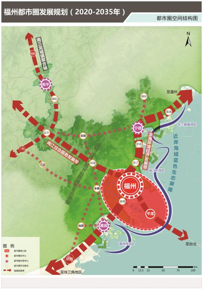 2021年6月,《福州都市圈发展规划》获国家发改委同意。随后,福建省人民政府印发《福州都市圈发展规划》,明确了福州都市圈的范围,指出将构建“一核三中心,两带三湾区”的空间结构,推动山海之间融合互动发展,创新沿海都市圈发展新范式。