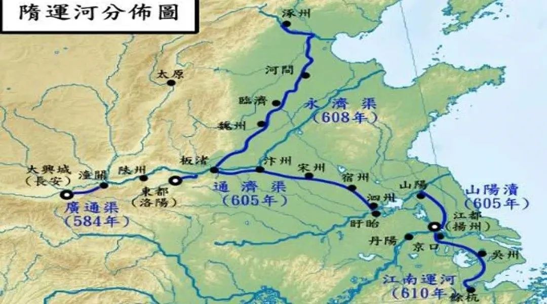 到了隋朝,再次实现大一统的大隋帝国用隋文帝和隋炀帝两代人的时间,先后开凿了广通渠、山阳渎、通济渠、永济渠、江南河,构建起了一条以洛阳为中心,北至涿郡(今北京),南至余杭(今杭州)的大运河,这就是此后在历史上赫赫有名的隋唐大运河和京杭大运河的前身。