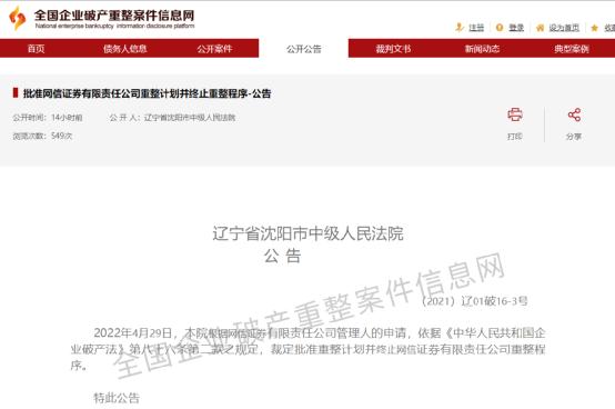 证监会表示,网信证券《关于北京指南针科技发展股份有限公司作为破产重整投资人受让网信证券有限责任公司100%股权所涉控股股东、实际控制人变更的申请报告》及相关文件收悉。经审核,证监会批复核准北京指南针科技发展股份有限公司成为网信证券主要股东。同日,沈阳市中院也在全国企业破产重整案件信息网发布公告。根据网信证券管理人申请,沈阳市中院裁定批准重整计划,并终止网信证券重整程序。