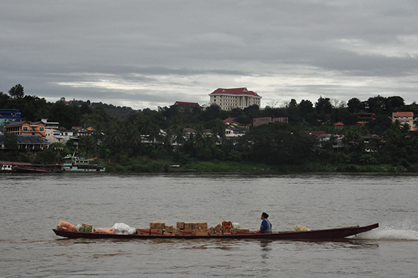 泰国出产的钢筋、油漆和饮料层层叠叠地装满了这条秋刀鱼的肚皮。瘦弱的船夫坐在船尾,前舱则坐着一个胖大的女老板娘压舱,大江东去浪千叠,山色一时苍茫。只不过从泰国运往老挝的都是初级工业制成品,老挝的经济实力可想而知有多惨淡。