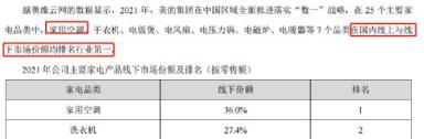 美的表示,据奥维云网的数据显示,美的集团“在25个主要家电品类中,家用空调、干衣机、电饭煲、电风扇、电压力锅、电磁炉、电暖器等7个品类在国内线上与线下市场份额均排名行业第一”。