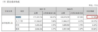 美的集团2021年原材料成本达到了1751亿元,占到营业成本的84.47%,同比增长了21.2%。