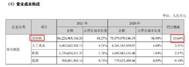 格力电器原材料成本则为862亿元,占营业成本比重更达到88.27%,同比增长13.64%。