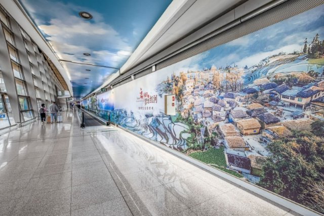 抵达机场,只见国内到达主通道两侧总长约150米的墙体上,呈现出红河州绝美的“巨幅画卷”。“画卷”在世界文化遗产·千年红河哈尼梯田中展开,囊括了百年滇越铁路历史人文风情、“一湖两城”滇南最美乡愁之旅、文艺范十足的弥勒特色小镇等多组精美画面。值得一提的是,这是有声“画卷”,伴随着悠扬的民族声乐,各地美景接连向旅客眼中袭来,不断有人驻足观看。