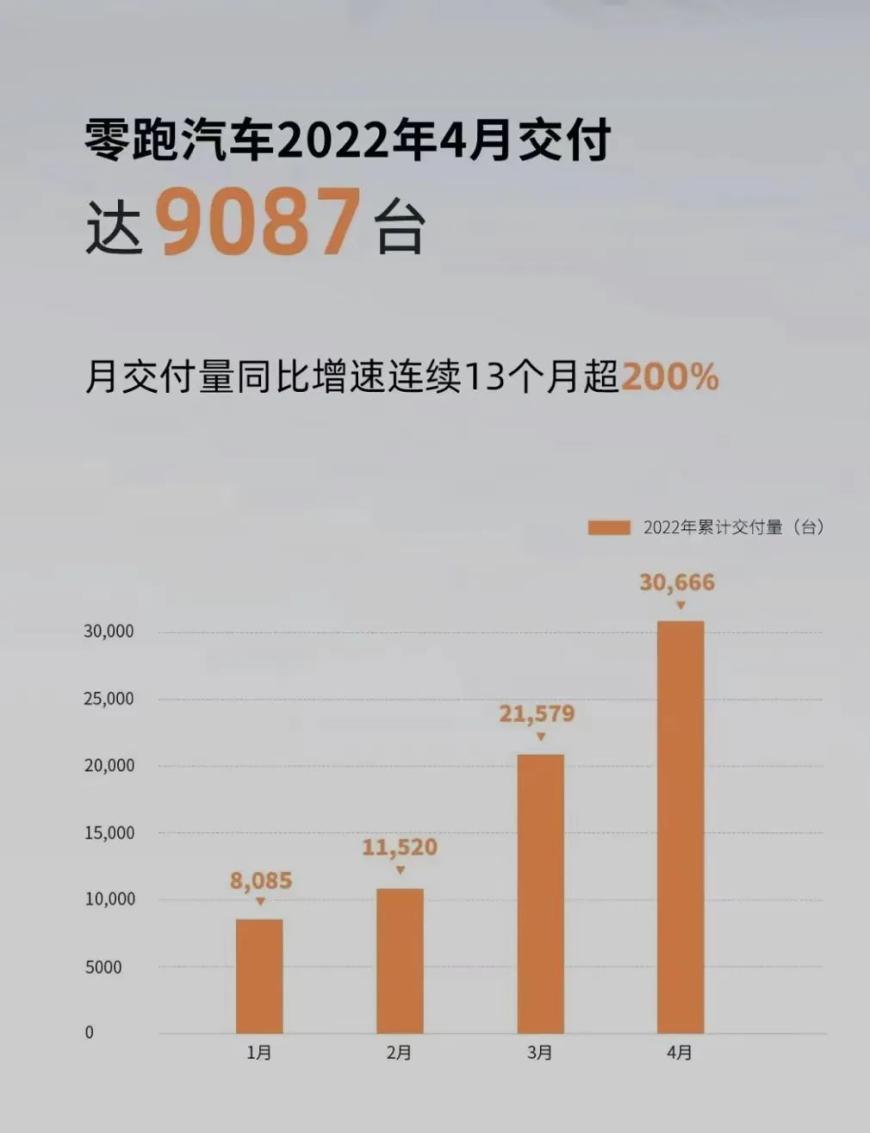 具体来看,零跑汽车4月销量9087辆,位居造车新势力月度交付量榜首,环比微跌0.10%。2022年1-4月,累计交付30666辆。