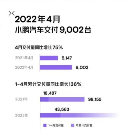 小鹏汽车4月交付量9002辆,同比增长75%,位列榜首。其中,小鹏P7交付3714辆;小鹏P5交付3564辆,小鹏G3系列交付1724辆。今年1-4月小鹏汽车累计交付43563辆,同比增长136%。