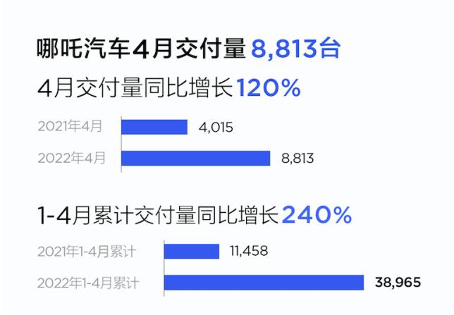 不过,与上月15414辆的交付量相比,今年4月,小鹏汽车的交付量环比下跌了41.60%。同日,哪吒汽车也披露了4月交付量“成绩单”,共交付新车8813辆,同比增长120%,环比下滑26.71%。1-4月,哪吒汽车累计交付38965 辆,同比增长 240%。