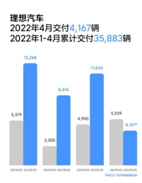 今年4月9日,蔚来曾发布声明称,因为疫情原因,公司位于吉林、上海、江苏等多地的供应链合作伙伴陆续停产。受此影响,蔚来整车生产已经暂停,近期不少用户的车辆会推迟交付。此外,理想汽车也于5月1日披露了最新交付数据。公司4月交付新车4167辆,同比下滑24.77%,环比下滑62.23%。
