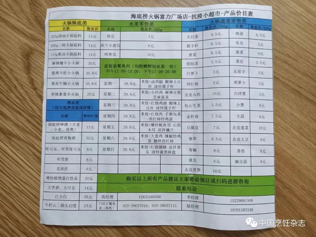 海底捞富力广场店的外卖产品价目表。 图/孙阳