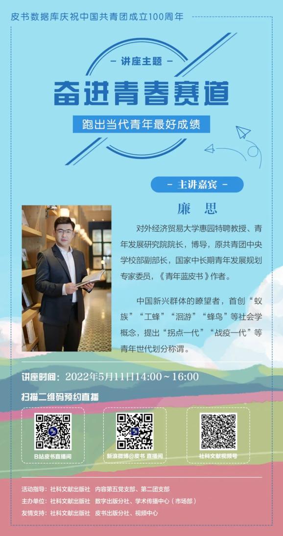 2022年,是中国共青团成立100周年。“青年是国家经济社会发展的生力军和中坚力量。党和国家事业要发展,青年首先要发展。”为助力青年发展,引导广大青年树立正确的奋斗观,以青年发展的学术研究成果指导自身行动,以积极心态面对学习、工作和生活,社会科学文献出版社皮书数据库继上线“青年发展”专题之后,隆重邀请皮书数据库中《青年蓝皮书》的作者,对外经济贸易大学惠园特聘教授、青年发展研究院院长,原共青团中央学校部副部长廉思教授,为大家带来“奋进青春赛道,跑出当代青年最好成绩”主题讲座。