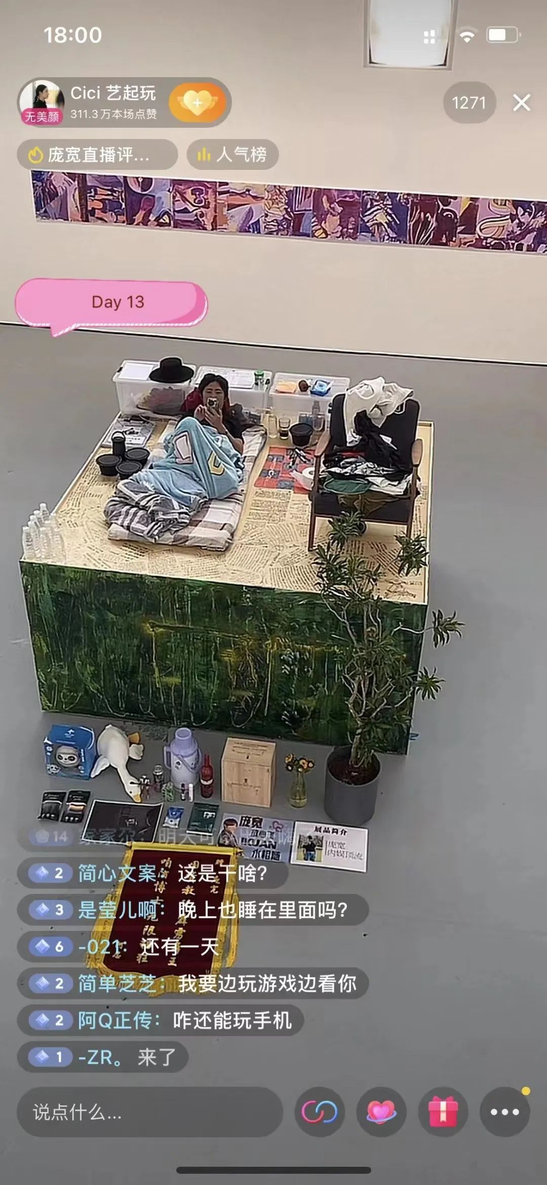 但无论是表演的行为,还是艺术的行为,庞宽在当下的这一行动都具有一次积极的意义。并且相当具有挑战。14天不间断直播,将自己完全暴露在屏幕观众前,将一个2.5x2.5平方米的平台当做家,一箱水,一箱速食盒饭,一箱就,一箱零食,一箱衣服,度过14日,亦是一件相当具有挑战的事情。